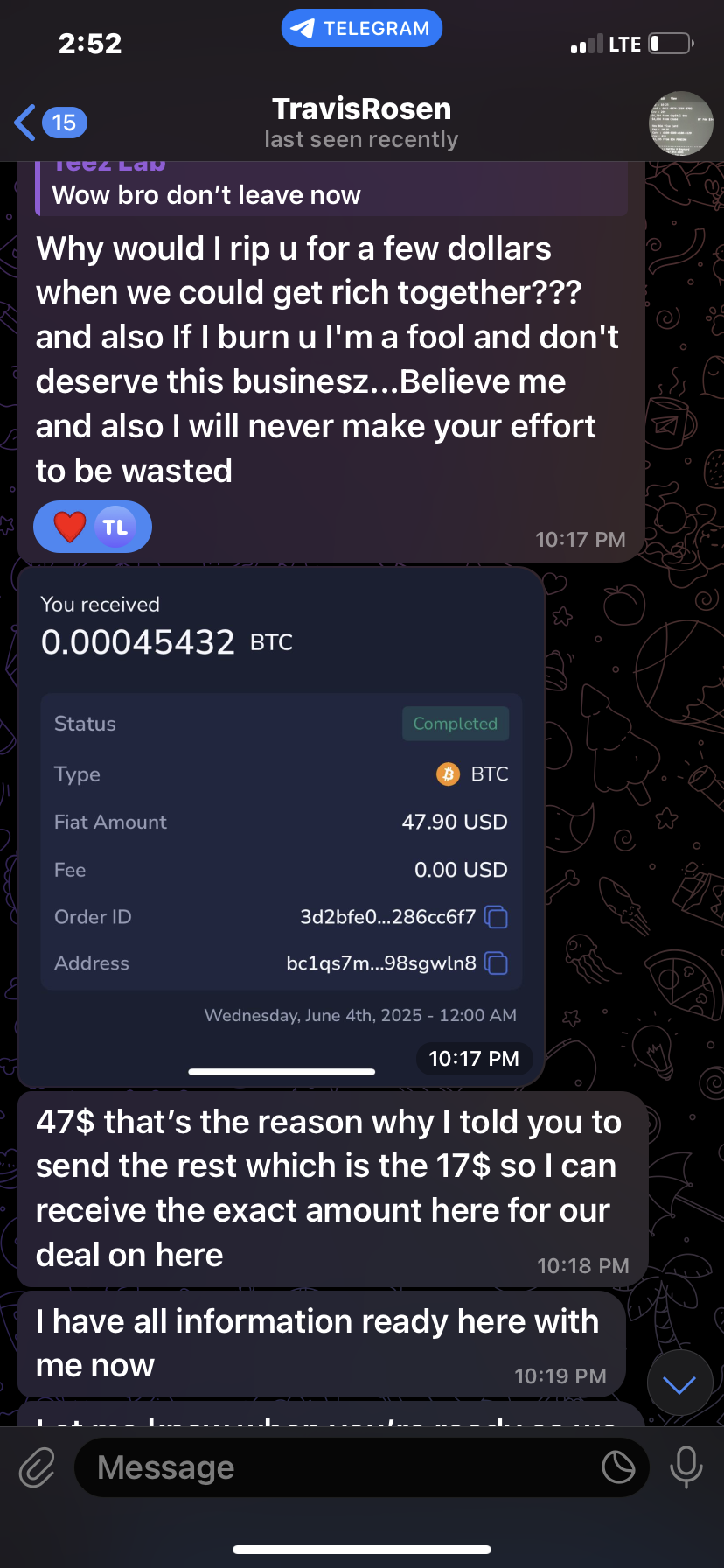 I’m posting this as a serious warning to avoid any dealings with a user named TravisRosen. I was scammed by this individual after they lied about payments, claimed not to receive funds I had already sent (with full proof via screenshots), and continued demanding more money without providing any results or fulfilling their end of the deal.